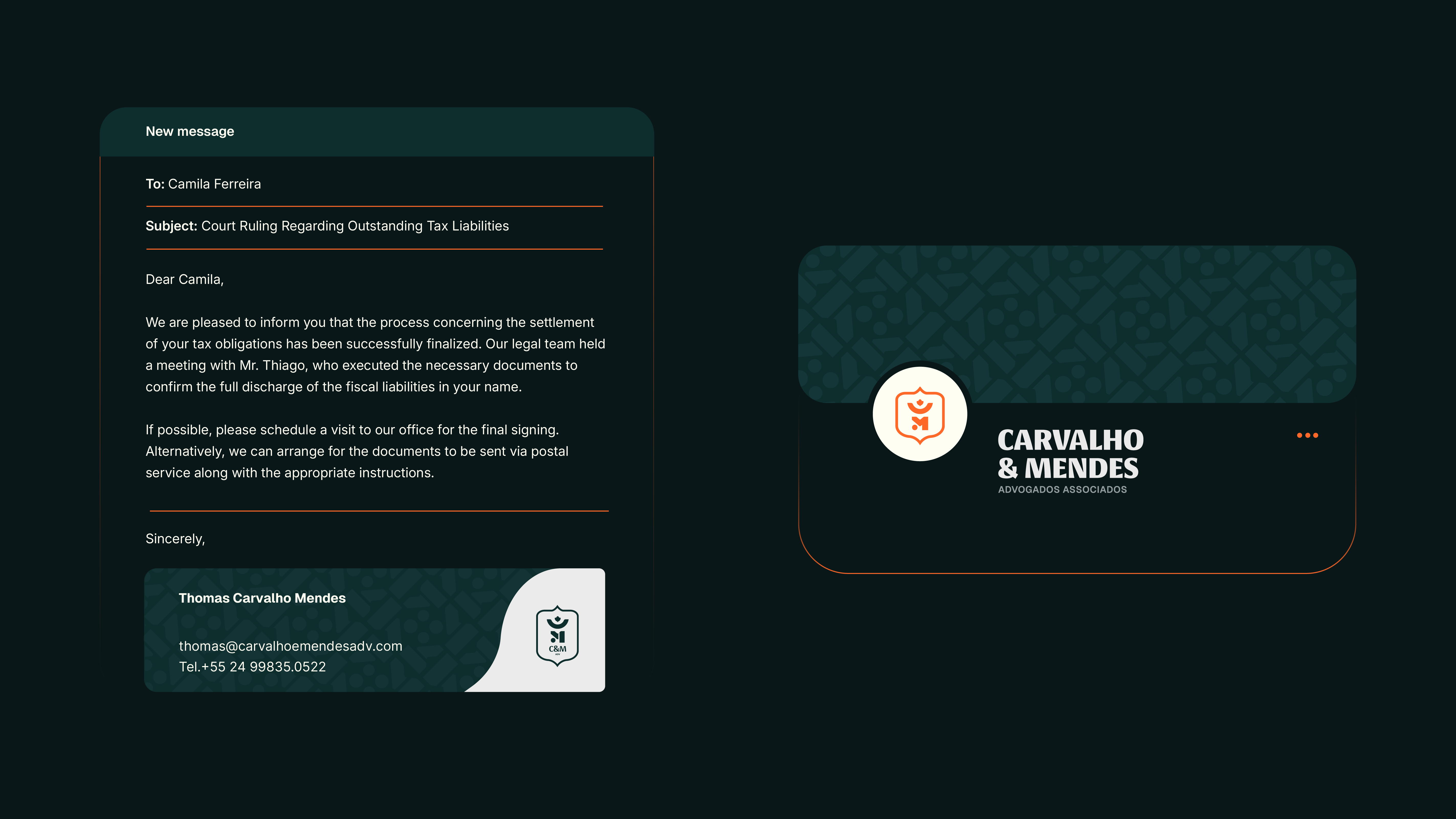 A estratégia da marca Carvalho & Mendes parte de um princípio claro: ser um escritório jurídico que honra suas raízes sem perder o olhar para o futuro. Essa dualidade, tradição e inovação, é o eixo central que orienta todas as decisões estratégicas, desde o posicionamento até a comunicação visual.Carvalho & Mendes se posiciona como um escritório que alia profundidade técnica à sensibilidade humana.