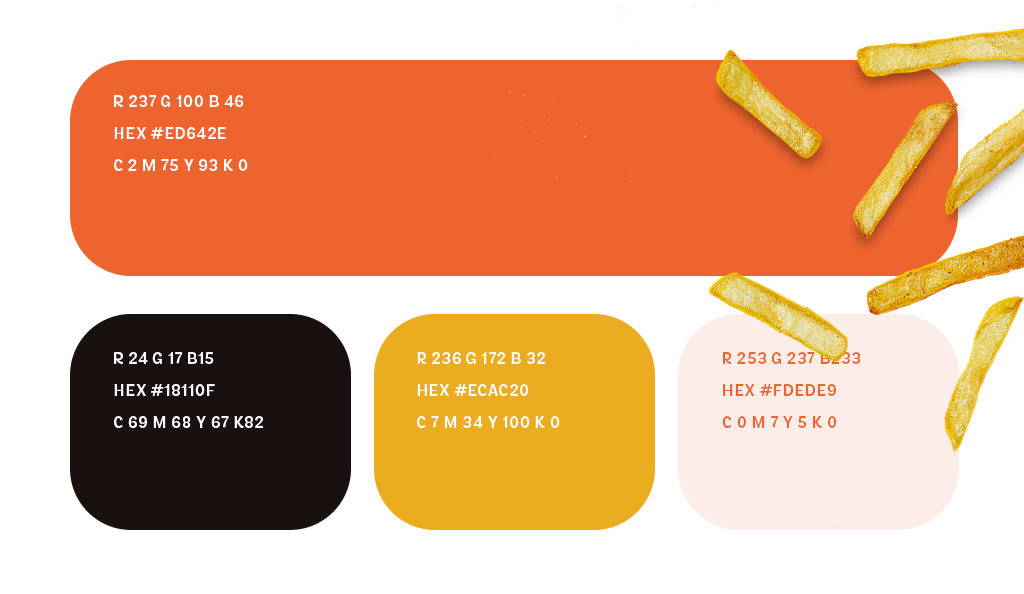 Pelo fato do principal ponto de contato da marca ser o restaurante físico, optamos por escolher cores bem saturadas e diversificadas, fato que destacaria a hamburgueria ao lado dos concorrentes, que possuem cores mais sóbrias e aspecto gourmet.