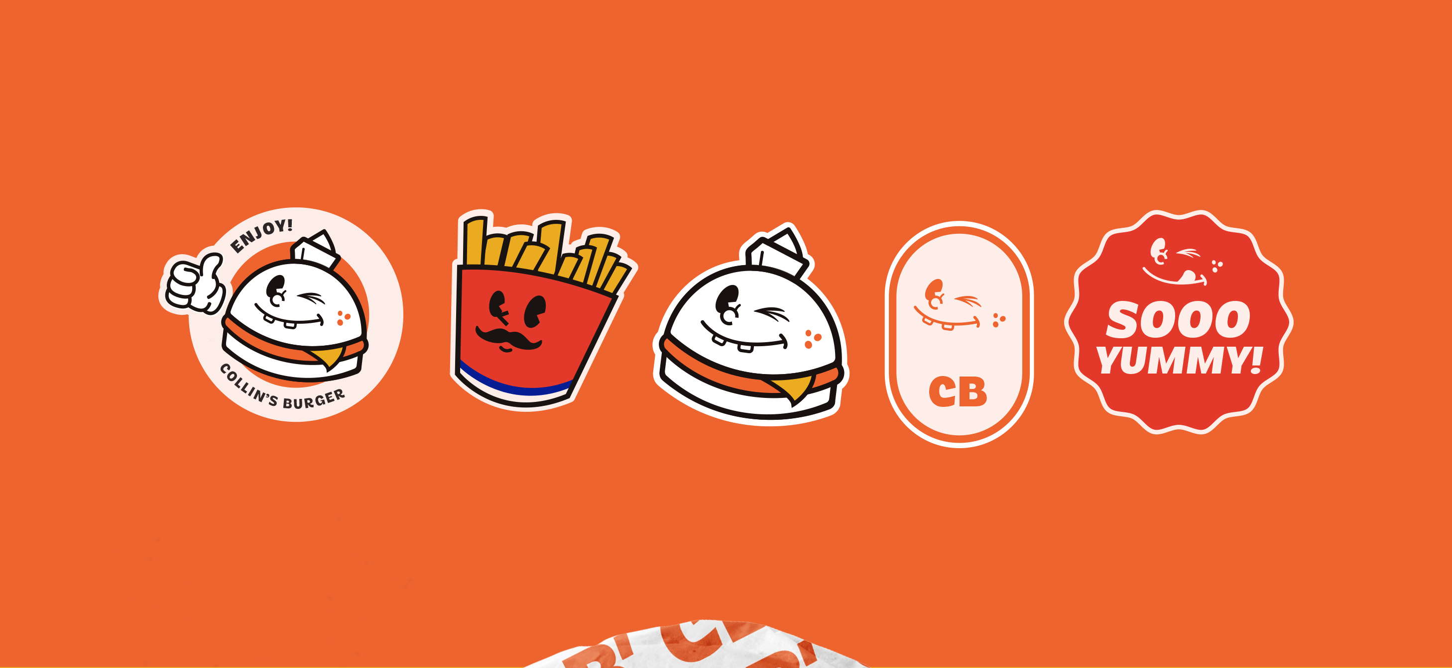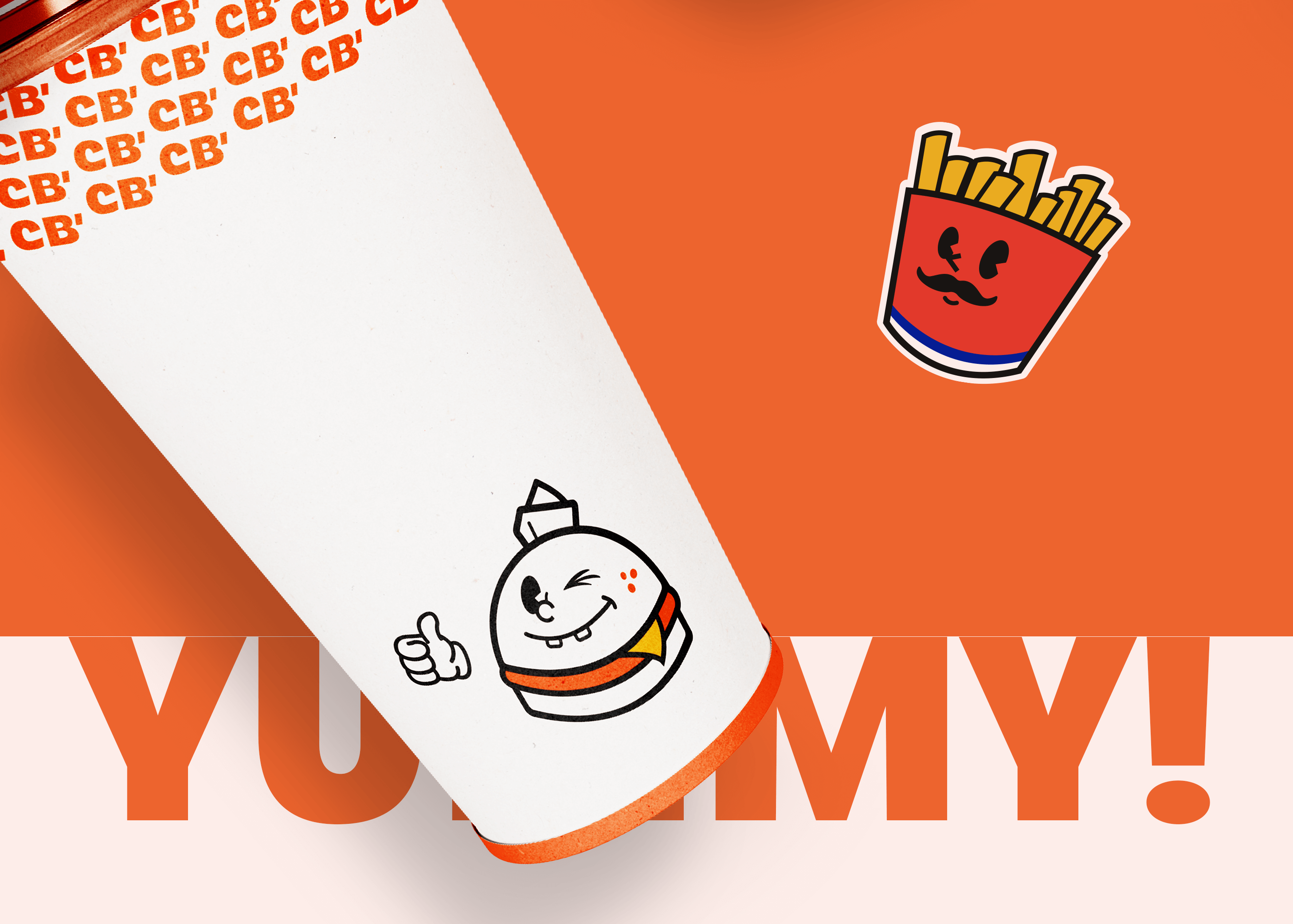 Primeiro, foi definido que o mascote seria um hambúrguer estilizado, representando diretamente o produto principal do negócio.